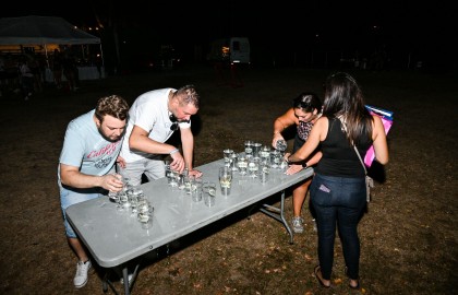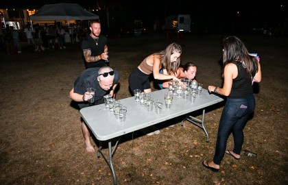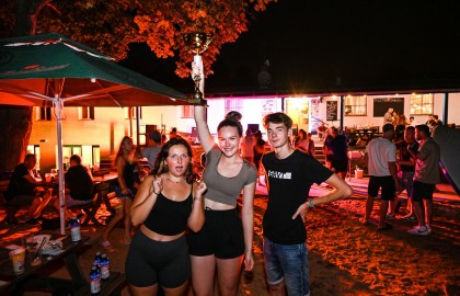 O něco později se u pingpongového stolu rozehrál beer pong, který po chvíli nadšeného jásotu a dramatického argumentování o tom, kdo má vypít více tekutého chleba, vzbudil velký zájem. Po několika kolech se zapojilo tolik přihlížejících, že se hra zvrhla v exování zvětralých piv a za nadšených výkřiků “divej, jak se to dělá!” míčky létaly skoro až na hrad Veveří.