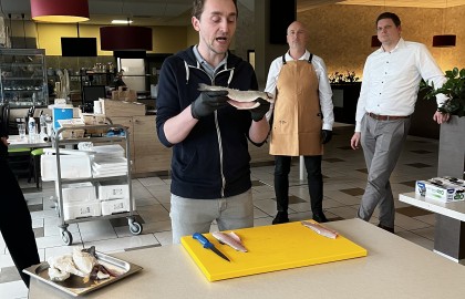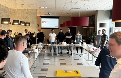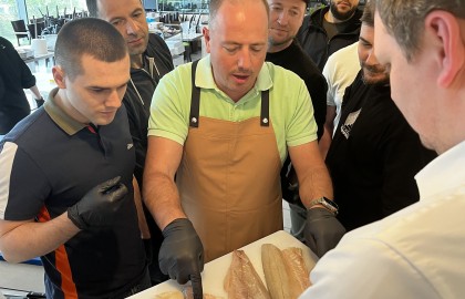Po úvodních formalitách a uvolněném seznámení jsme se společně se školiteli a zástupci Makra vrhli na ryby, tedy tu teoretickou část. Na několika slidech jsme se seznámili s tím, jak funguje moderní rybolov, jakým způsobem se ryby chovají, že se čerstvé ryby nakupují pomocí divoké aukce a že čerstvě vylovené ryby je nutné nechat alespoň dva dny odpočívat na ledu, než se mohou jíst. Za tu dobu stihnou z trhů ve Francii pohodlně doputovat až do Česka, takže ryby jsou vždy naprosto čerstvé. Také jsme se naučili poznat čerstvé ryby, což bylo především pro kuchaře opakování každodenní rutiny.