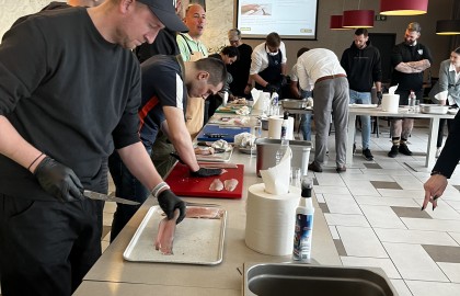 Následovala praktická část, kdy jsme se naučili očistit a filetovat různé ryby, od základního pstruha přes pražmu po většího mořského vlka. Vše šlo tak hladce, že spousta z nás zvládla bez problému připravit tři i více ryb. Následoval malý testík, jak poznat čerstvou a jak rozmraženou rybu, což by mohlo na první pohled vypadat poněkud zapeklitě, ale pravdou je, že to zas takový oříšek nebyl. Stačilo si vzpomenout, že maso rozmrazené ryby se neleskne, protože voda v ní obsažená se po rozmrazení nevrací do tkáně, a tak působí suše až potrhaně. Čerstvá ryba se hezky leskne.